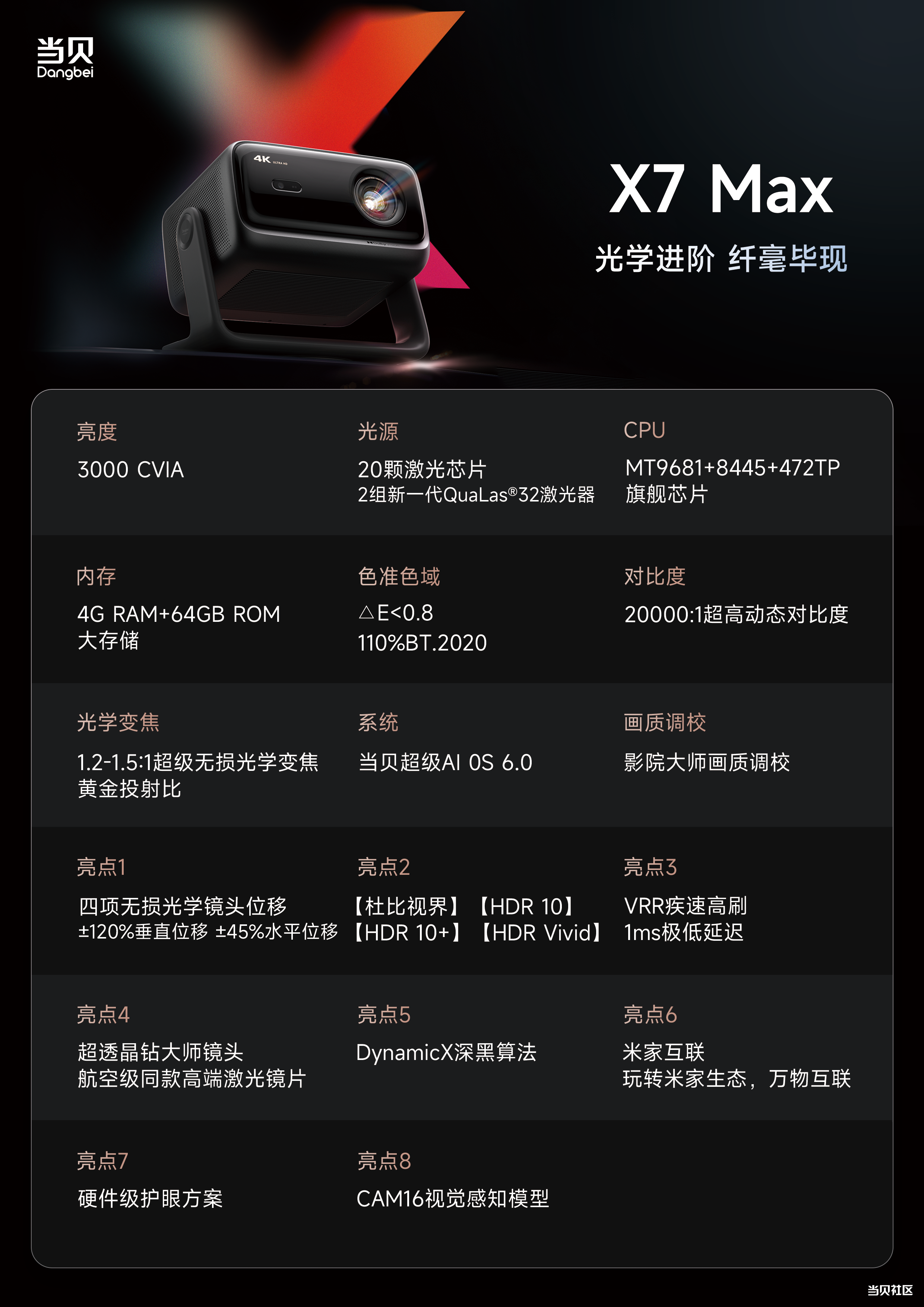 得益于双TOF+CMOS模组,在自动对焦和自动梯形校正时当贝F3都更加快速精确。除此之外这款当贝F3的基本配置为4+64GB ,CPU为Mstar938。亮度为惊人的2050ANSI即使白天使用都异常的清晰。清晰度为1080P至高4K的高清画质,刷新率可以达到至高120HZ连接PS4、XBOX等游戏也不会卡顿产生延迟。